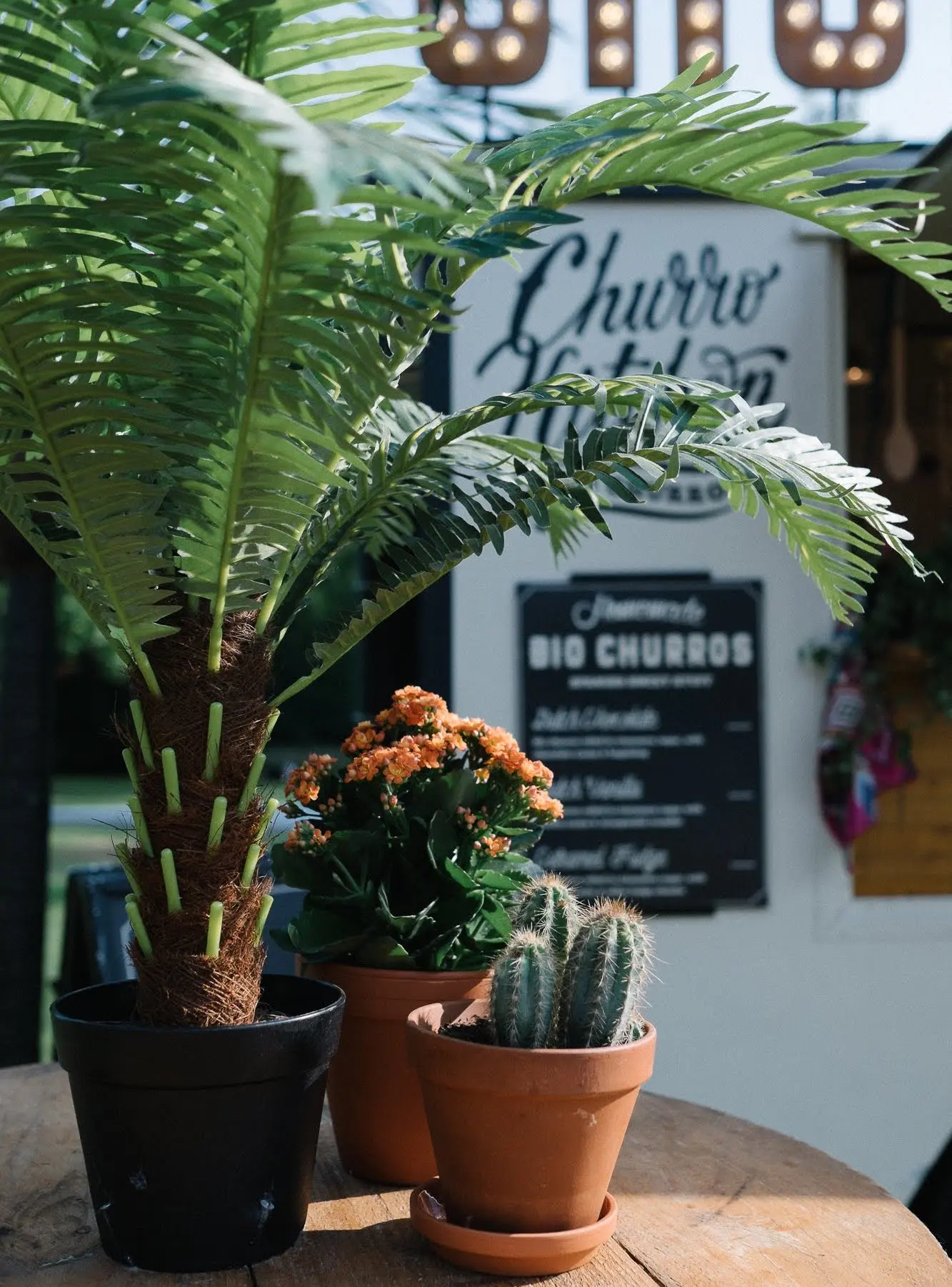 Kleine plantjes op de serveerbank, bloemen in vintage vaasjes, kruiden in terracotta potjes – het voegt groen toe en maakt de opstelling levendig. Vooral bij streetfood-concepten die focussen op vers en duurzaam is dit een belangrijk element.