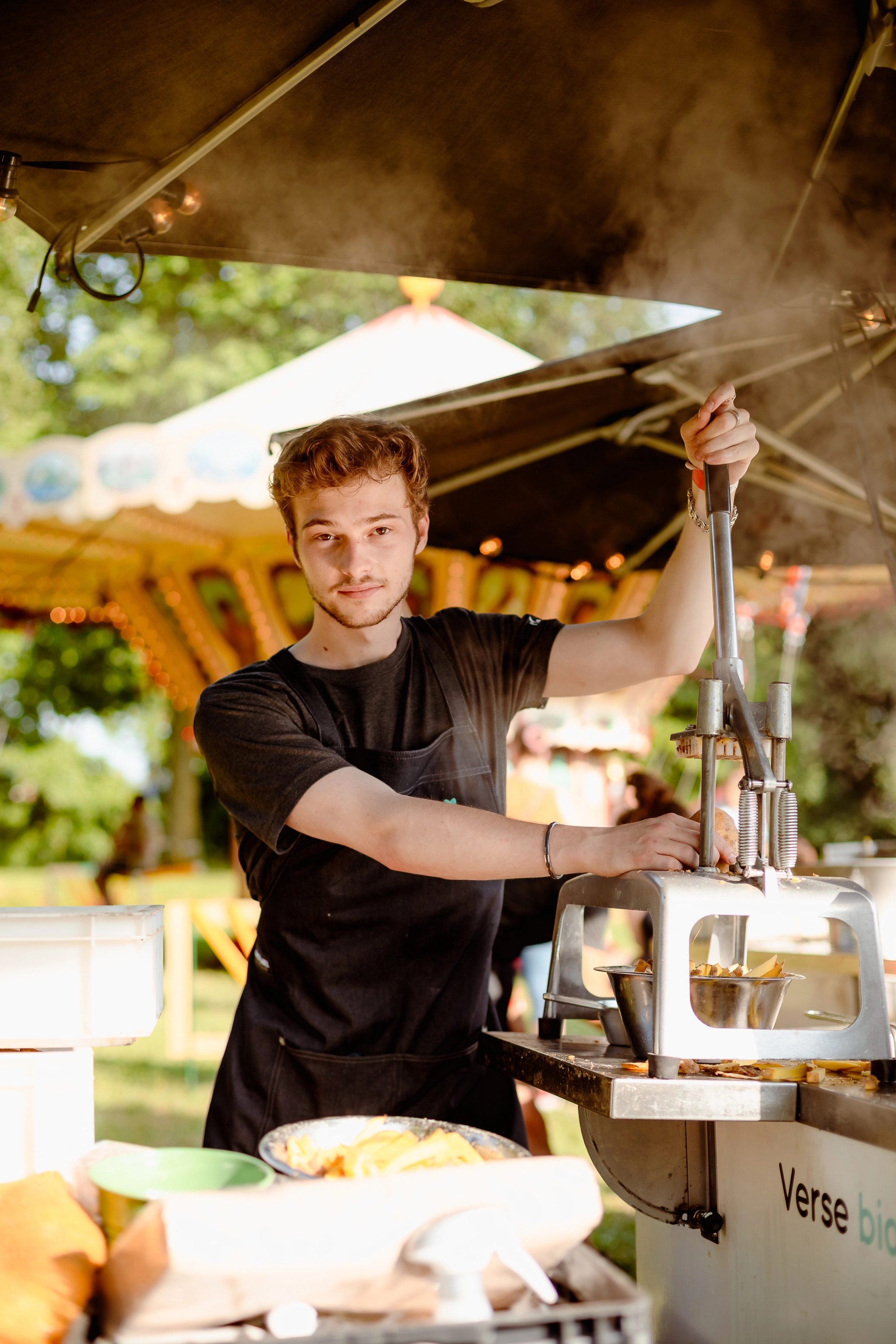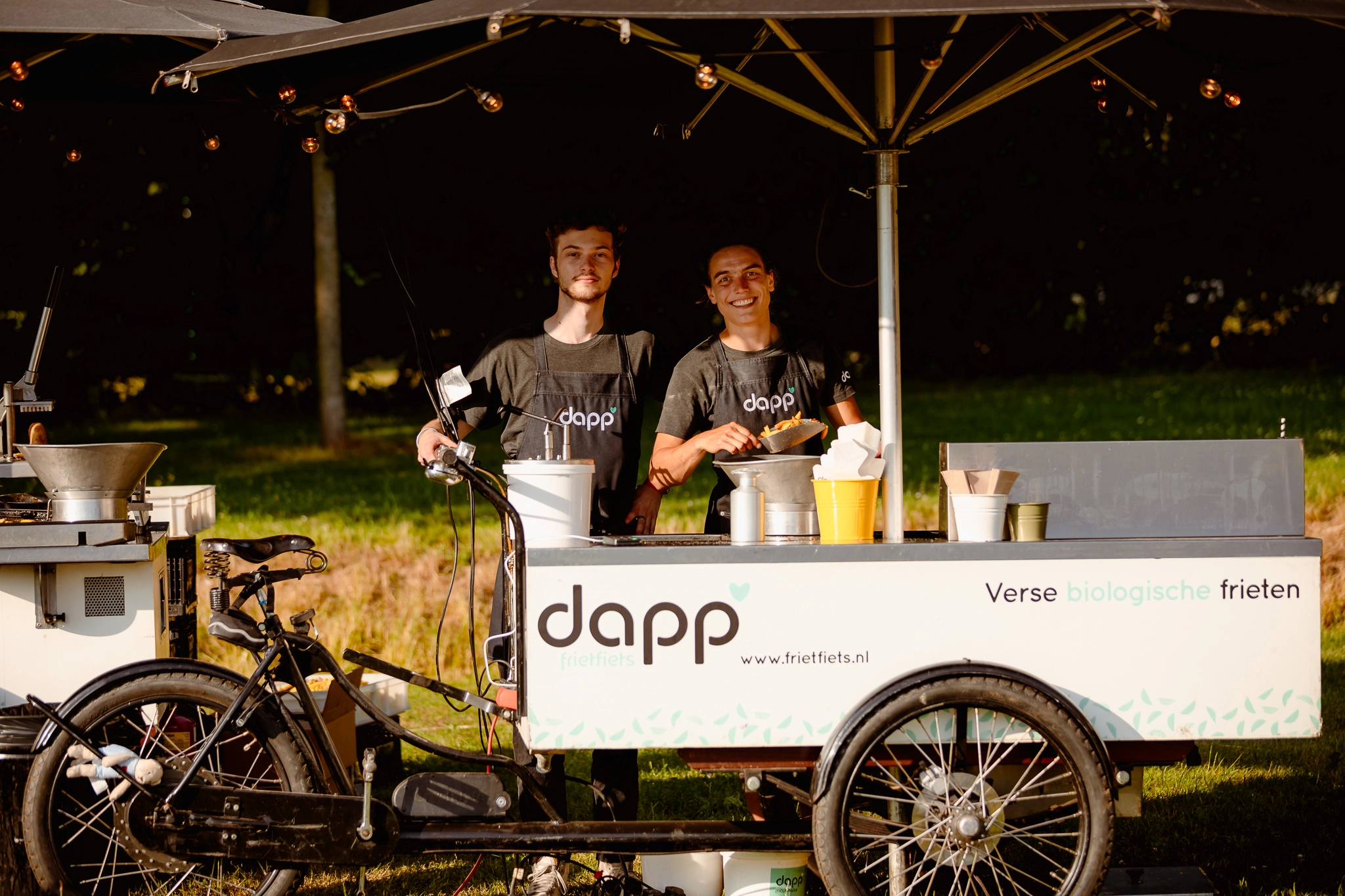 Bemande frietfiets met verse biologische friet, 240 porties per uur. Winnaar AD-friettest. Schaalbaar tot 6 fietsen voor grote events.