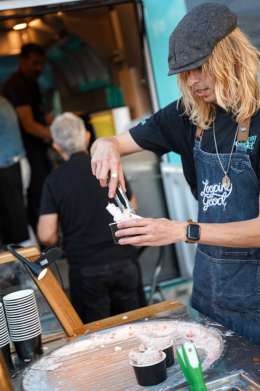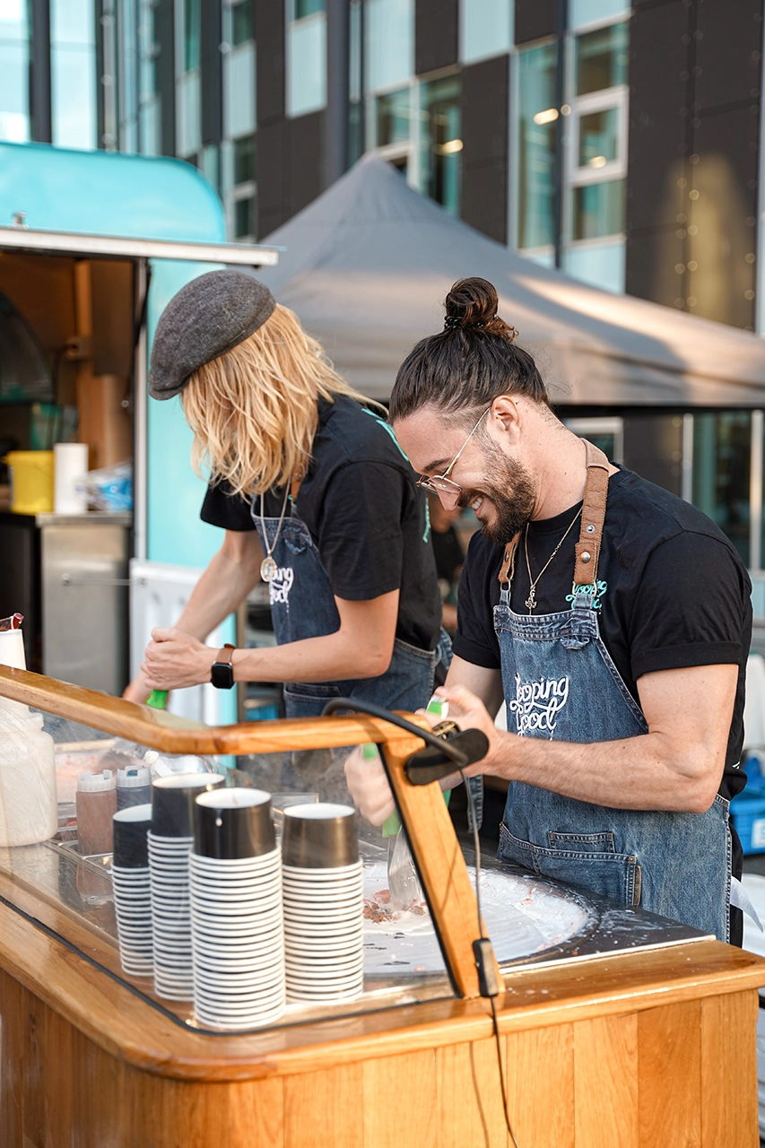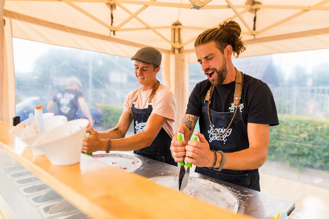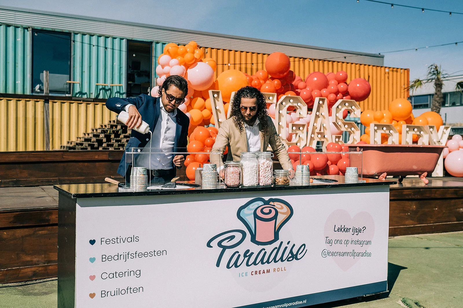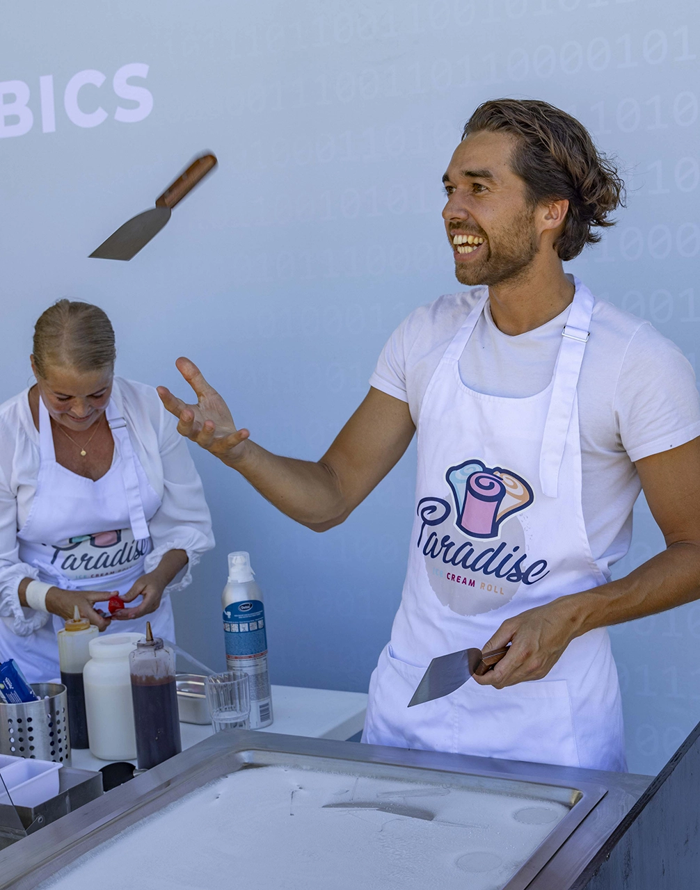 Thai ijsrollen live bereid op platen van min 30 graden, inclusief DJ-booth en energiek team van 20. Entertainment en dessert in één.