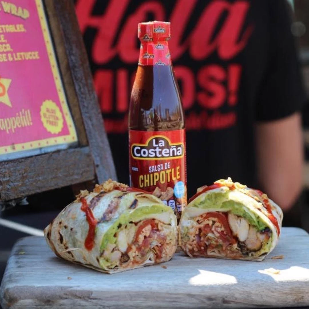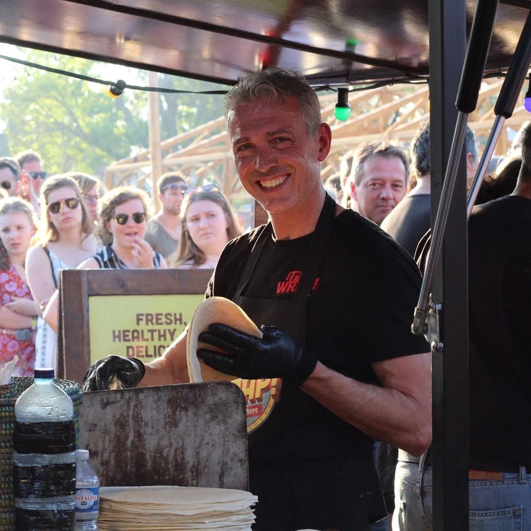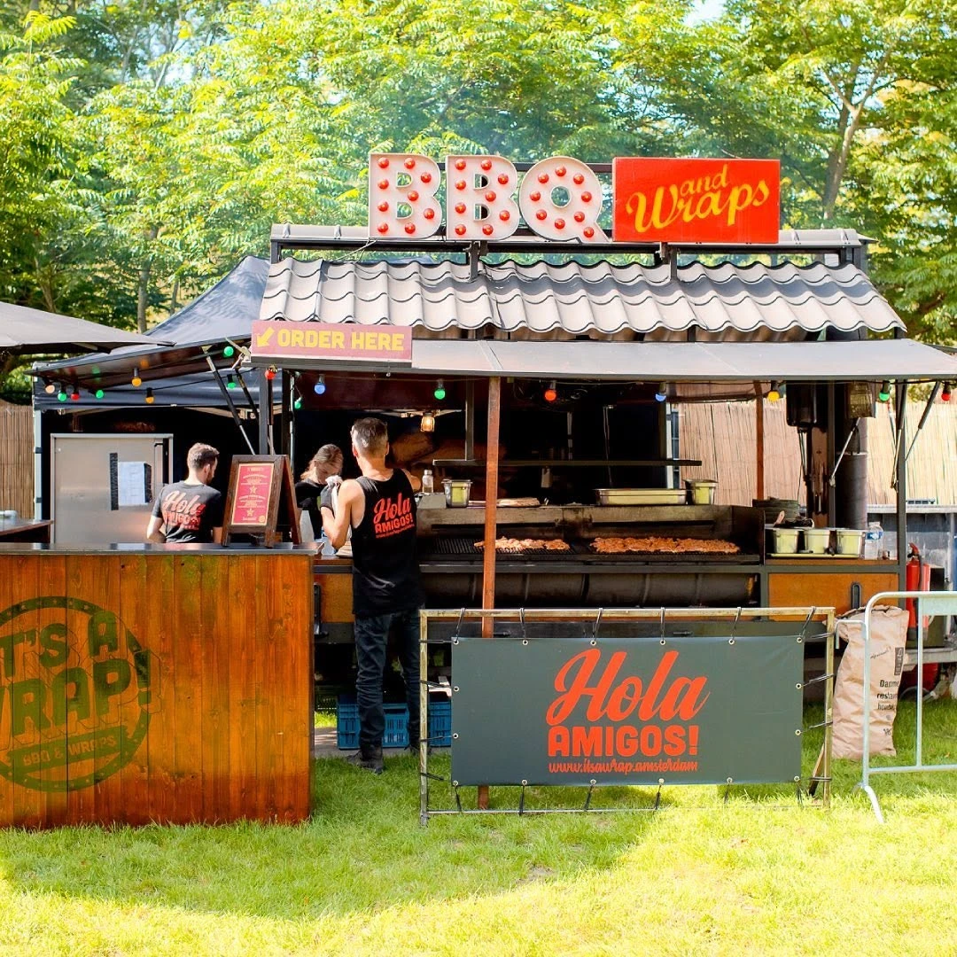 Zuid-Amerikaanse wraps live gegrild op houtskool BBQ in een open keuken. Meer dan 150 wraps per uur, vegan variant beschikbaar.