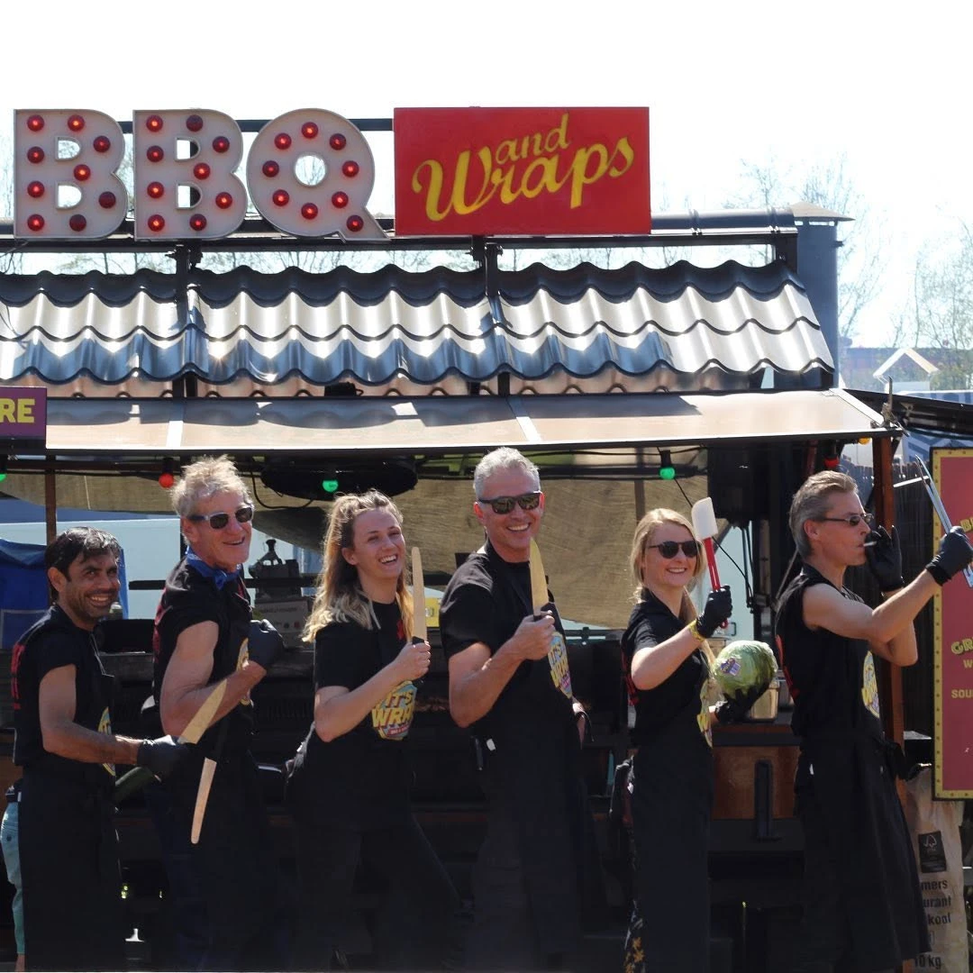 Zelfgebouwde BBQ-wagen met ambachtelijk gerookt vlees. Pulled pork 12 uur, brisket 14 uur. Beter Leven Keurmerk en 480 broodjes per uur.