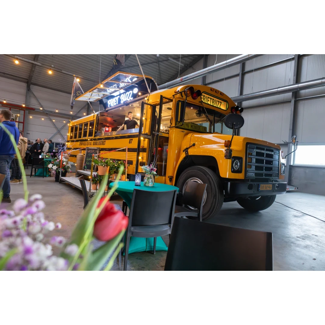 Gerestaureerde Amerikaanse schoolbus van 13 meter met 1100 porties friet per uur en vijf thematische menu's tot luxe walking diner.