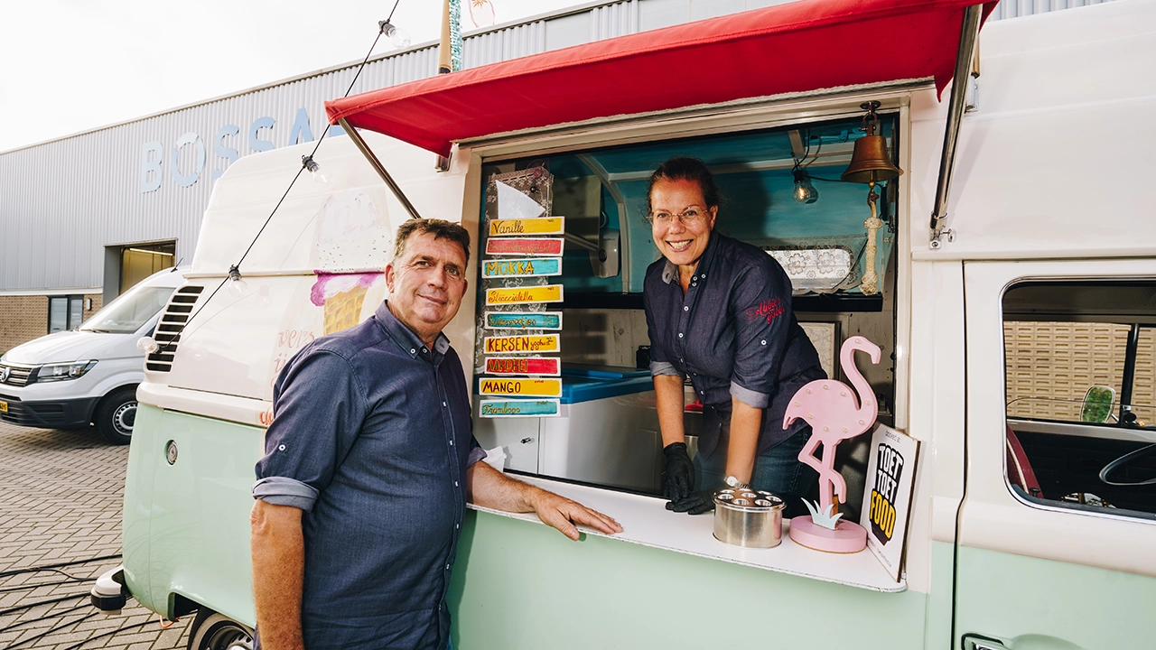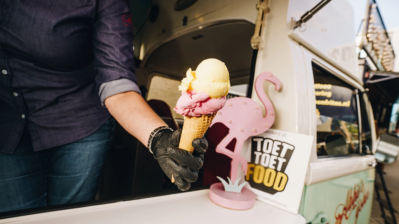 Een charmante VW T2 uit '78 vol ambachtelijk schepijs. Vanille, stracciatella en lactosevrije smaken. Plus: vers gebakken vanillewafels!