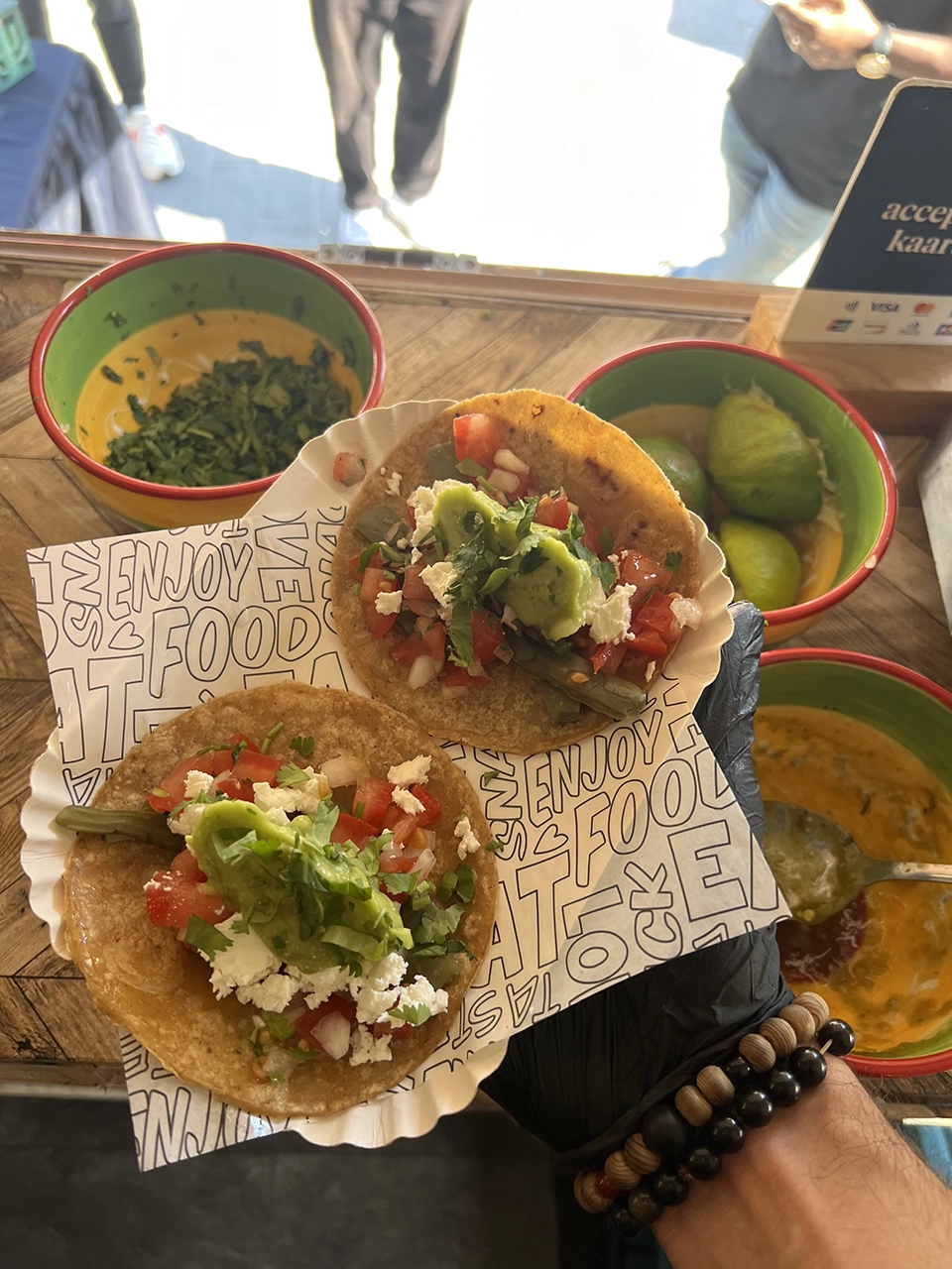 Authentieke taco's van een Mexicaans echtpaar. Pulled porc, chorizo, cactusbladeren. Met glutenvrije tortilla's en huisgemaakte salsa's.
