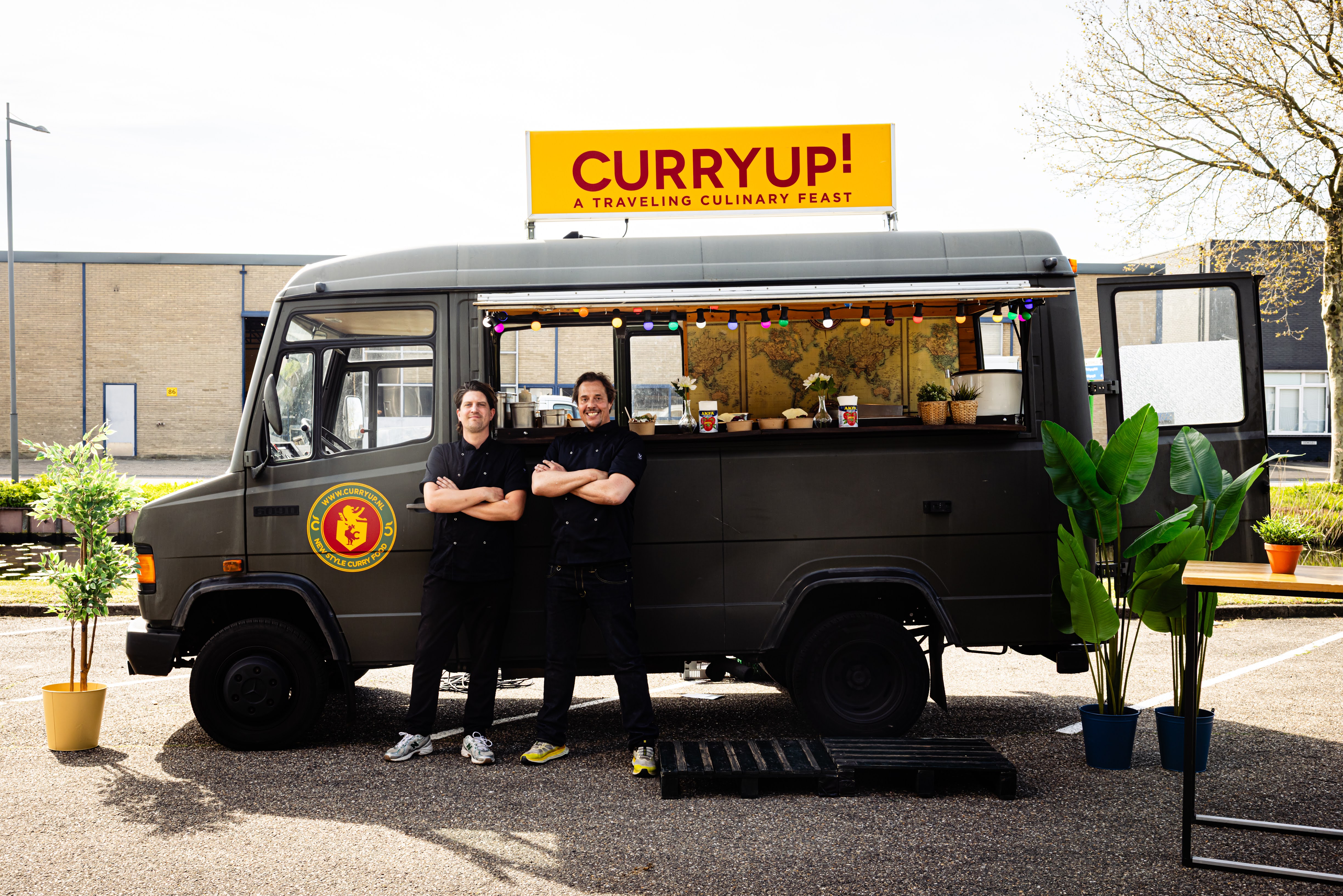 Een vrolijk beschilderde legerambulance vol Surinaams-Javaanse streetfood. Bara's, roti en saoto ajam, halal én vegan mogelijk.